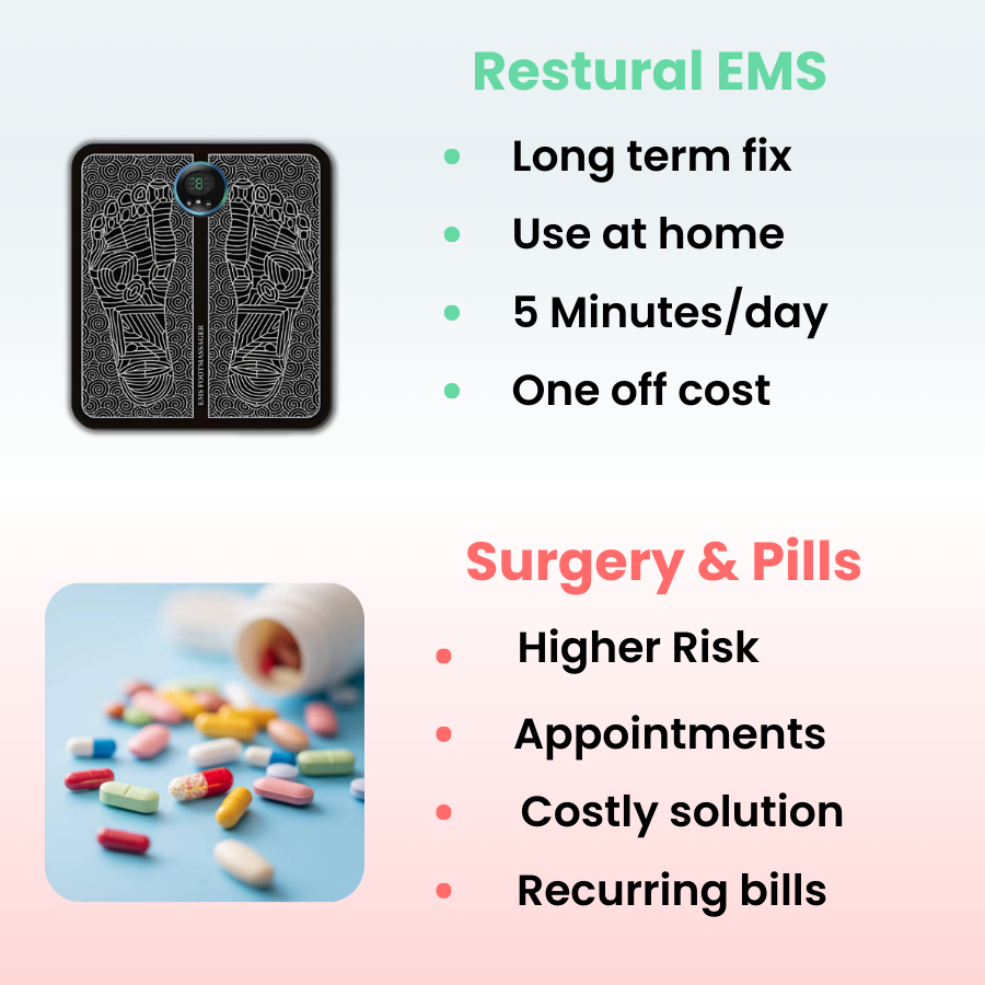 Stop wasting money on pills or surgeries that don't work for everyone. Our device offers an affordable, non-invasive solution. With our EMS, improve your strength and mobility at home, all while saving on costly treatment visits.
